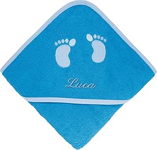Erwin Müller Frottier Kinder-Kapuzenbadetuch mit Name - Kapuzenhandtuch inklusive Bestickung - Badetuch für Baby - Fußabdruck - 100% Baumwolle - blau - Größe 80x80 cm